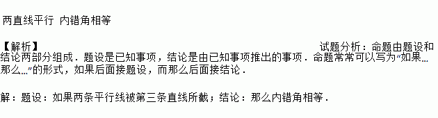 两直线平行 内错角相等 【解析】试题分析:命题由题设和结论两部分组成.题设是已知事项,结论是由已知事项推出的事项.命题常常可以写为“如果…那么…”的形式,如果后面接题设,而那么后面接结论. 【解析】 题设:如果两条平行线被第三条直线所截;结论:那么内错角相等.