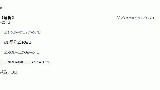 如图,已知点O在直线AB上,∠COE=90°,OD平分∠AOE,∠COD=25°,则∠BOD的度数为( )