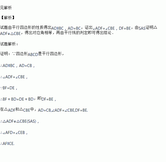 如图,在?ABCD中,连结BD,在BD的延长线上取一点E,在DB的延长线上取一点F,使BF=DE,连结AF,CE.