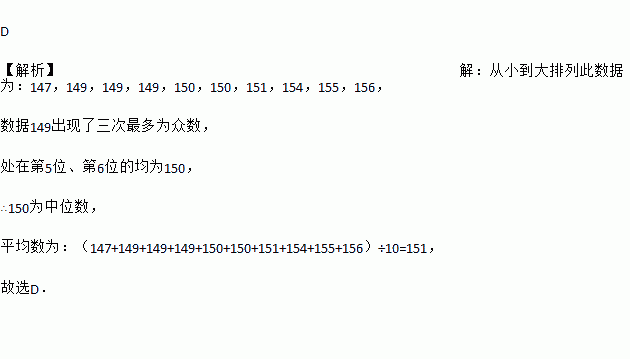 D 【解析】【解析】 从小到大排列此数据为:147,149,149,149,150,150,151,154,155,156, 数据149出现了三次最多为众数, 处在第5位、第6位的均为150, ∴150为中位数, 平均数为:(147+149+149+149+150+150+151+154+155+156)÷10=151, 故选D.