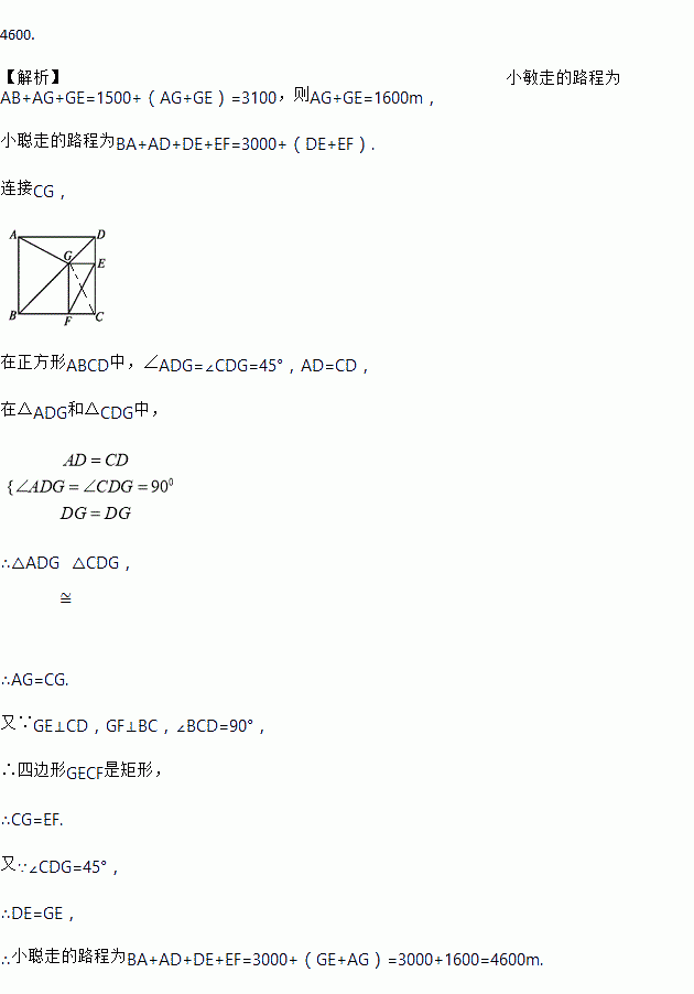 如图为某城市部分街道示意图,四边形ABCD为正方形,点G在对角线BD上,GE⊥CD,GF⊥BC,AD=1 500 m,小敏行走的路线为B→A→G→E,小聪行走的路线为B→A→D→E→F.若小敏行走的路程为3 100 m,则小聪行走的路程为 m.