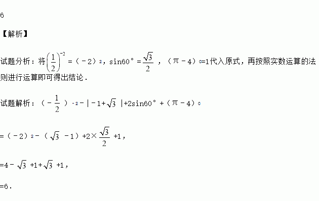 计算:(﹣)﹣2﹣|﹣1+|+2sin60°+(π﹣4)0.