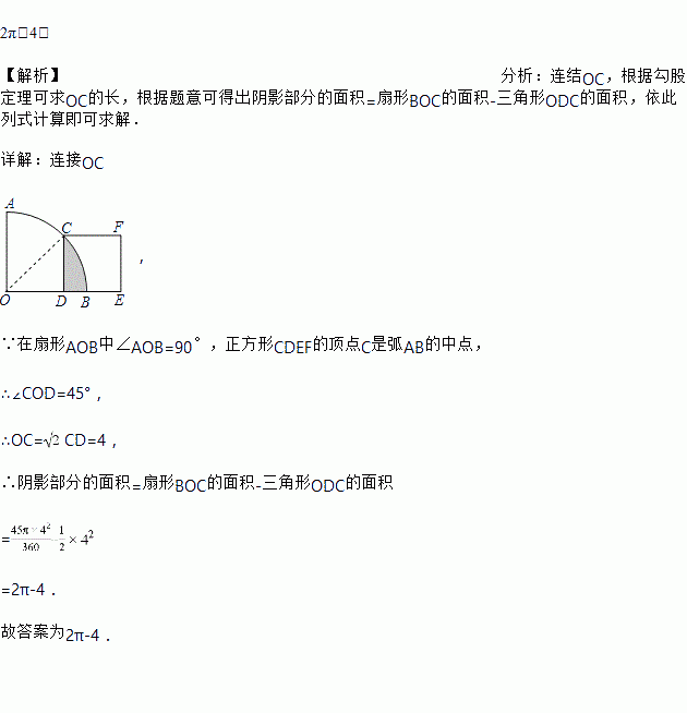 如图,在扇形AOB中,∠AOB=90°,正方形CDEF的顶点C是弧AB的中点,点D在OB上,点E在OB的延长线上,当正方形CDEF的边长为2时,阴影部分的面积为_____.