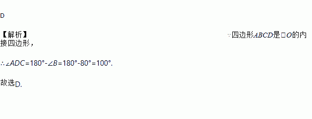 D 【解析】∵四边形ABCD是⊙O的内接四边形, ∴∠ADC=180°-∠B=180°-80°=100°. 故选D.
