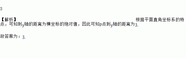 3 【解析】根据平面直角坐标系的特点,可知到y轴的距离为横坐标的绝对值,因此可知P点到y轴的距离为3. 故答案为:3.