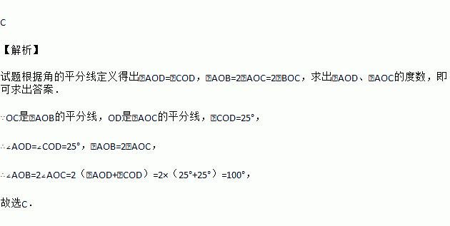 如图,OC是∠AOB的平分线,OD是∠AOC的平分线,且∠COD=25°,则∠AOB等于( )