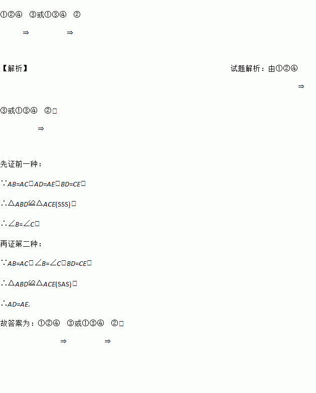 如图,在△ABD和△ACE中,有下列四个判断:①AB=AC;②AD=AE;③∠B=∠C;④BD=CE,请以其中三个判断为条件,另一个为结果,写出一个正确的结论______________________(用序号???⇒?形式写出).