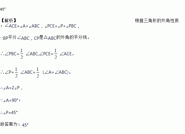 如图,P是△ABC的∠ABC和∠ACB的外角的平分线的交点,若∠A=90°,则∠P=_____________.
