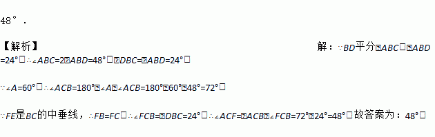 如图,△ABC中,BD平分∠ABC,BC的中垂线交BC于点E,交BD于点F,连接CF.若∠A=60°,∠ABD=24°,则∠ACF=______.