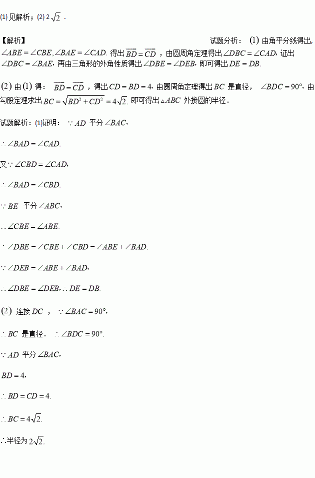 (2)若∠BAC=90°,BD=4,求△ABC外接圆的半径.