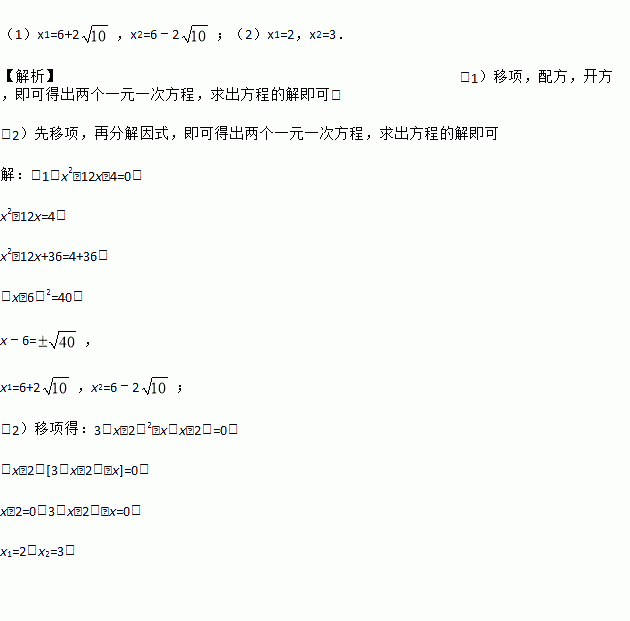 (1)x1=6+2,x2=6﹣2;(2)x1=2,x2=3. 【解析】(1)移项,配方,开方,即可得出两个一元一次方程,求出方程的解即可; (2)先移项,再分解因式,即可得出两个一元一次方程,求出方程的解即可 【解析】 (1)x2﹣12x﹣4=0, x2﹣12x=4, x2﹣12x+36=4+36, (x﹣6)2=40, x﹣6=, x1=6+2,...