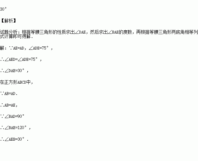 已知:如图所示,E为正方形ABCD外一点,AE=AD,∠ADE=75°,求∠AEB的度数.