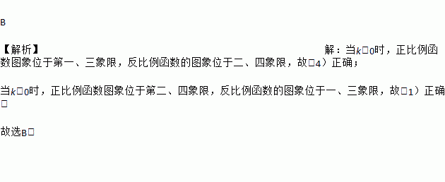 B 【解析】【解析】 当k>0时,正比例函数图象位于第一、三象限,反比例函数的图象位于二、四象限,故(4)正确; 当k<0时,正比例函数图象位于第二、四象限,反比例函数的图象位于一、三象限,故(1)正确. 故选B.