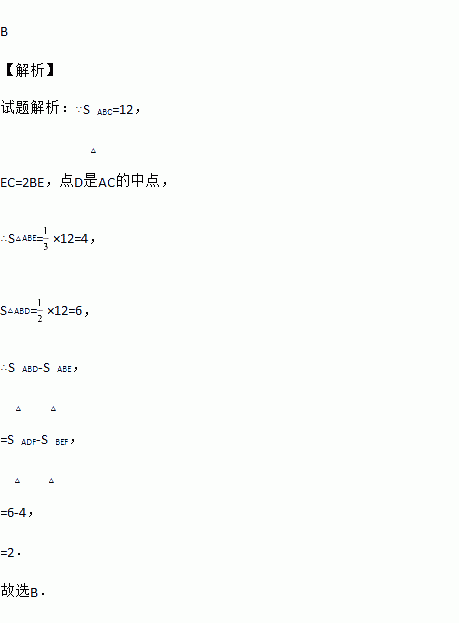 如图,在△ABC中,E是BC上的一点,EC=2BE,点D是AC的中点,设△ABC,△ADF,△BEF的面积分别为S△ABC,S△ADF,S△BEF,且S△ABC=12,则S△ADF-S△BEF=( )
