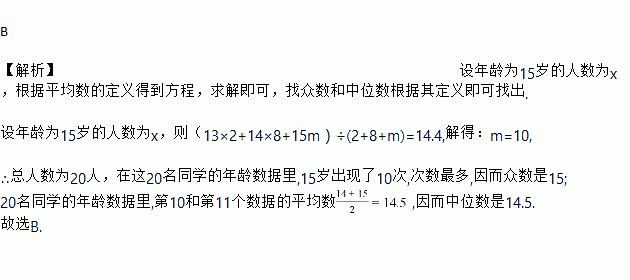 若干名同学的年龄如下表所示,这些同学的平均年龄是14.4岁,则这些同学年龄的众数和中位数分别是( )
