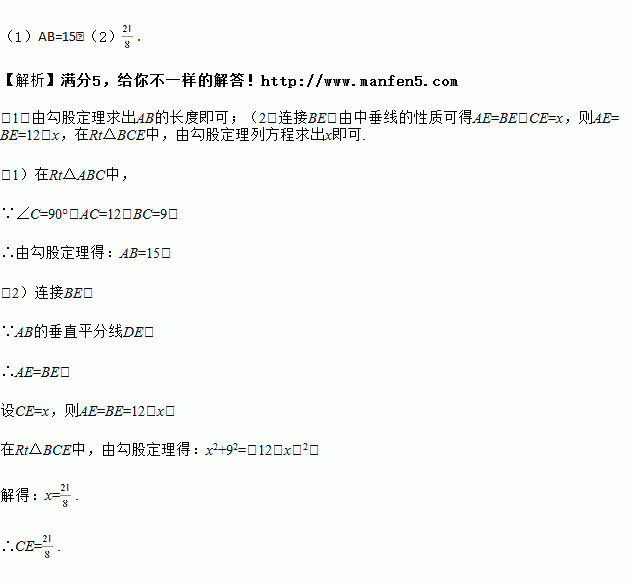 如图,在Rt△ABC中,∠C=90°,AC=12,BC=9,AB的垂直平分线分别交AB、AC于点D、E,