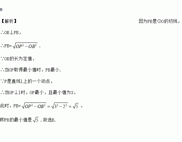 如图,⊙O的半径为2,点O到直线l的距离为3,点P是直线l上的一个动点.若PB切⊙O于点B,则PB的最小值是( )