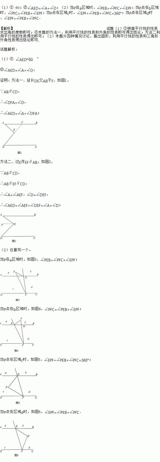 ②猜想图①中∠AED,∠EAB,∠EDC的关系,并用两种不同的方法证明你的结论.