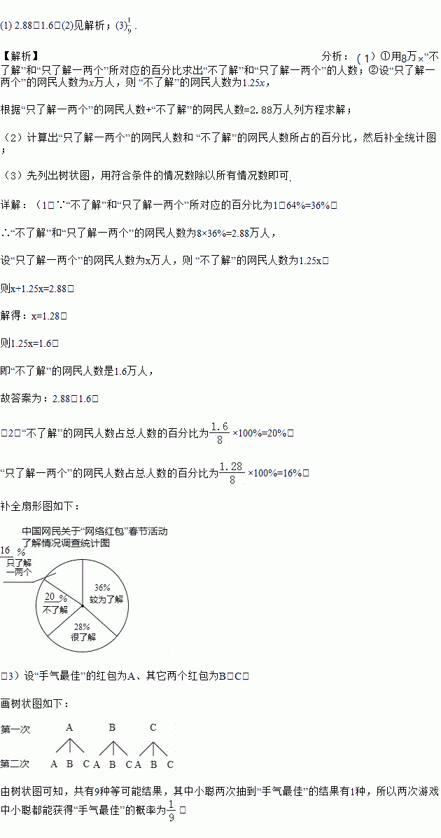 “网络红包”是互联网运营商、商家通过组织互联网线上活动、派发红包的互联网工具,是朋友间互道祝福的表达形式之一.“网络红包”春节活动已经逐渐深入到大众的生活中,得到了人们较为广泛的关注.根据某咨询公司(2018年中国春节“网络红包”专题调查报告》显示:在接受调查的8万名网民中,对“网络红包”春节话动了解程度的占比方面,“较为了解”和“很了解”的网民共占比64%,分别占比36%和28%.在“不了解”和“只了解一两个“的受访网民中,“不了解”的网民人数比“只了解一两个”的网民人数多25%.如图是该咨询公司绘制的“中国网民关于‘网络红包’春节活动了解情况调查”统计图(不完整).