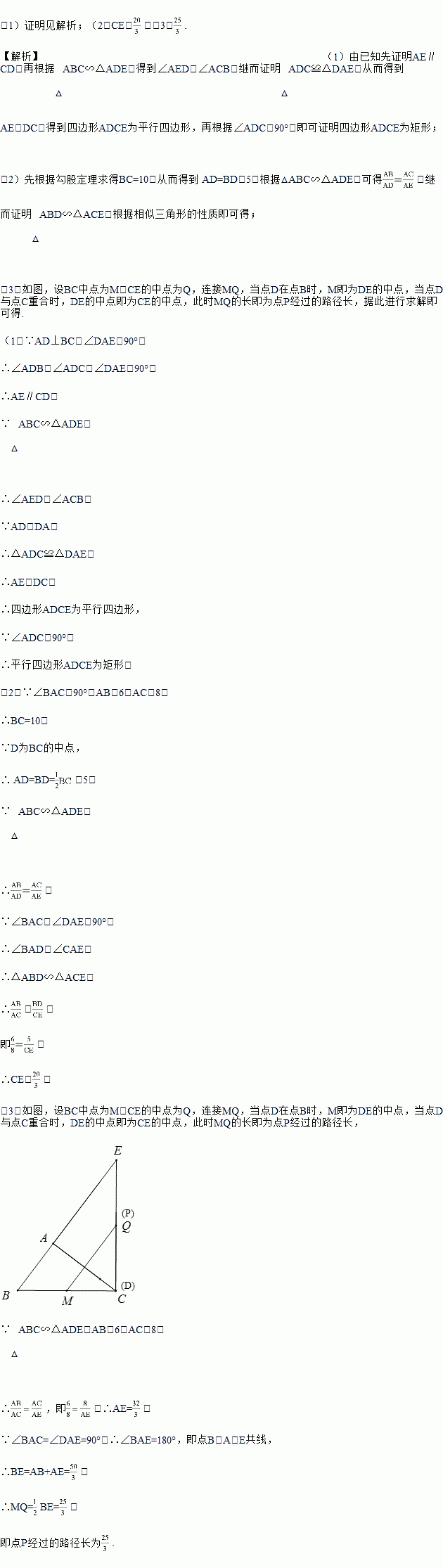 (3)当点D从点B运动到点C时,设P为线段DE的中点,求在点D的运动过程中,点P经过的路径长(直接写出结论).