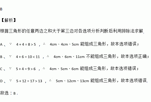 A. 4cm、4cm、5cm B. 4cm、6cm、11cm C. 4cm、5cm、6cm D. 5cm、12cm、13cm