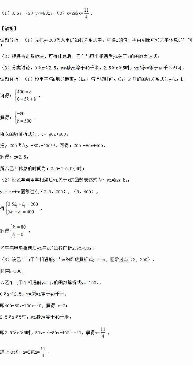 甲、乙两辆汽车分别从A、B两地同时出发,沿同一条公路相向而行,乙车出发2h后休息,与甲车相遇后,继续行驶.设甲、乙两车与B地的路程分别为y甲(km),y乙(km),甲车行驶的时间为x(h),y甲、y乙与x之间的函数图象如图所示,结合图象解答下列问题: