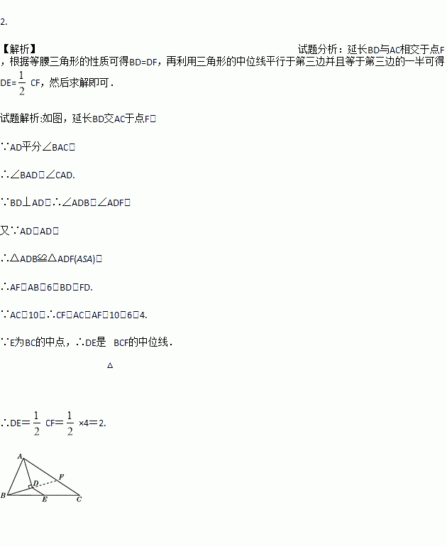 如图,在△ABC中,已知AB=6,AC=10,AD平分∠BAC,BD⊥AD于点D,点E为BC的中点,求DE的长.
