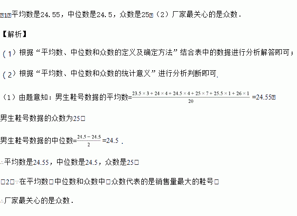 (2)在平均数,中位数和众数中,鞋厂最感兴趣的是什么?