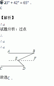 直线AB∥CD,∠B=23°,∠D=42°,则∠E=( )