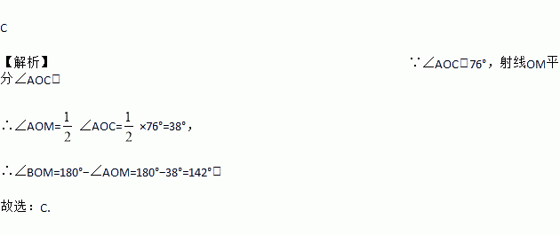 C 【解析】∵∠AOC=76°,射线OM平分∠AOC, ∴∠AOM=∠AOC=×76°=38°, ∴∠BOM=180°?∠AOM=180°?38°=142°, 故选:C.