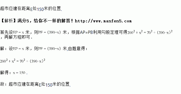 A,B两个居民楼在公路同侧,它们离公路的距离分别为AE=200米,BF=70米,它们的水平距离EF=390米.现欲在公路旁建一个超市P,使超市到两居民楼的距离相等,则超市应建何处?为什么?