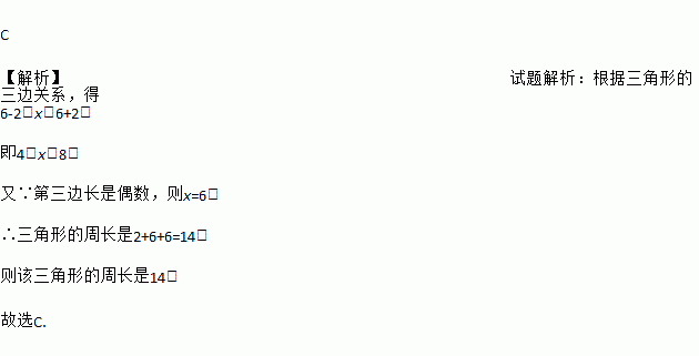 一个三角形的两边长为2和6,第三边为偶数.则这个三角形的周长为 ( )