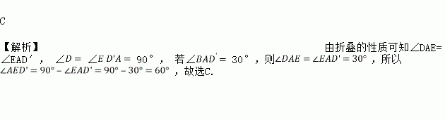 如图,将矩形ABCD沿AE折叠,若∠BAD′=30°,则∠AED′ 等于( )