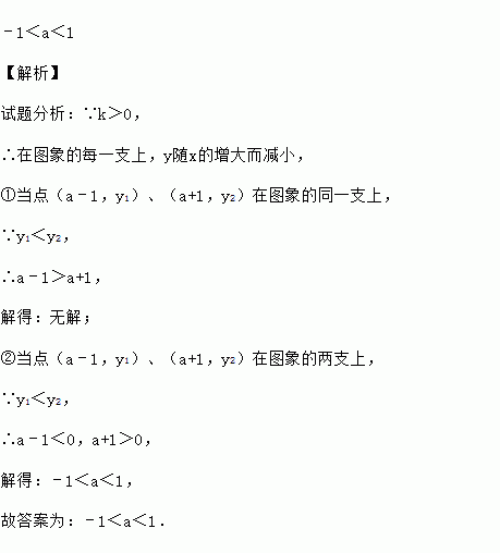 点(a﹣1,y1)、(a+1,y2)在反比例函数(k>0)的图象上,若y1<y2,则a的范围是 .