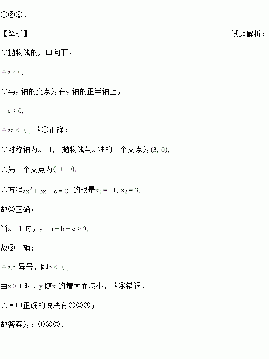 ①ac<0; ②方程ax2+bx+c=0的根是x1=﹣1,x2=3