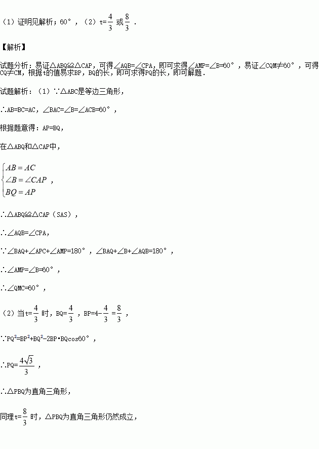 (1)经过1秒时,连接AQ、CP交于点M,则在P、Q运动的过程中,求证: