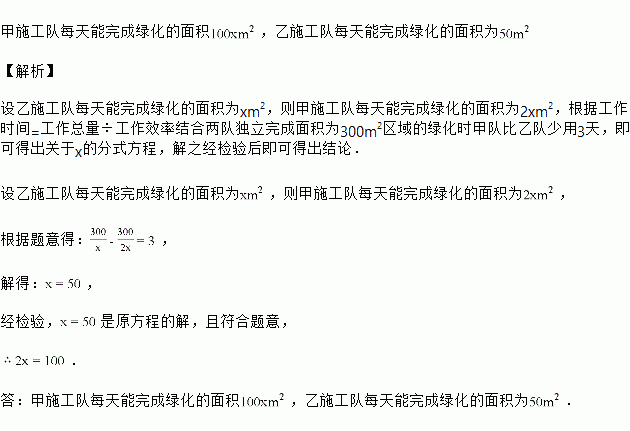 区域的绿化时,甲队比乙队少用3天,求甲、乙两施工队每天分别能完成绿化的面积是多少?
