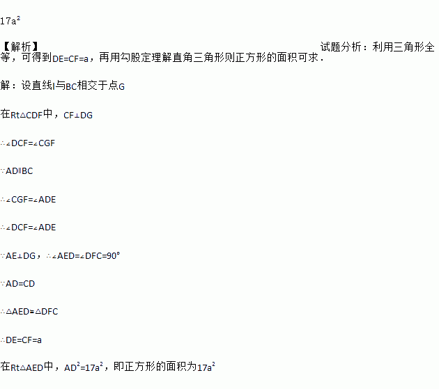 如图,直线l过正方形ABCD的顶点D,过A、C分别作直线l的垂线,垂足分别为E、F.若AE=4a,CF=a,则正方形ABCD的面积为_____.