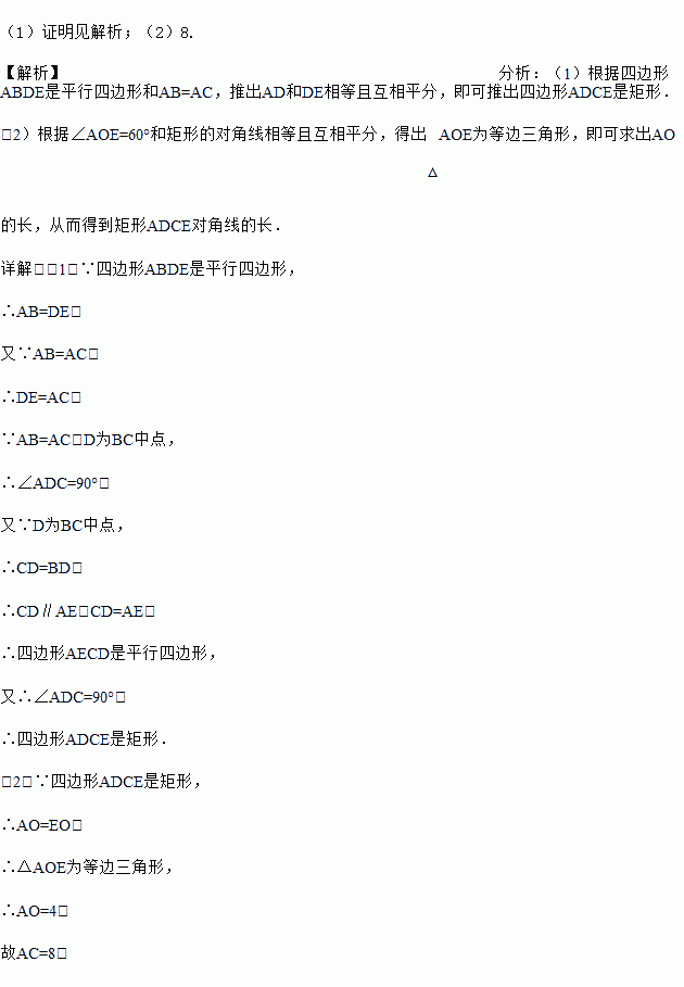 (2)若∠AOE=60°,AE=4,求矩形ADCE对角线的长.