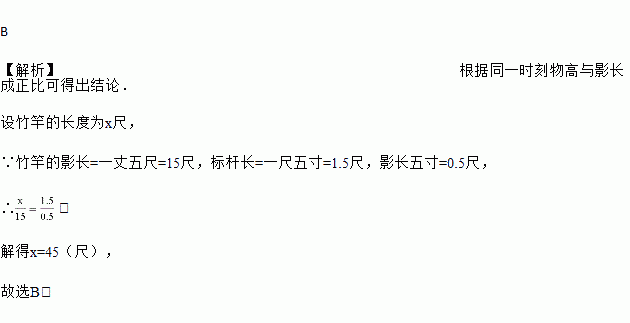 《孙子算经》是中国古代重要的数学著作,成书于约一千五百年前,其中有首歌谣:今有竿不知其长,量得影长一丈五尺,立一标杆,长一尺五寸,影长五寸,问竿长几何?意即:有一根竹竿不知道有多长,量出它在太阳下的影子长一丈五尺,同时立一根一尺五寸的小标杆,它的影长五寸(提示:1丈=10尺,1尺=10寸),则竹竿的长为( )