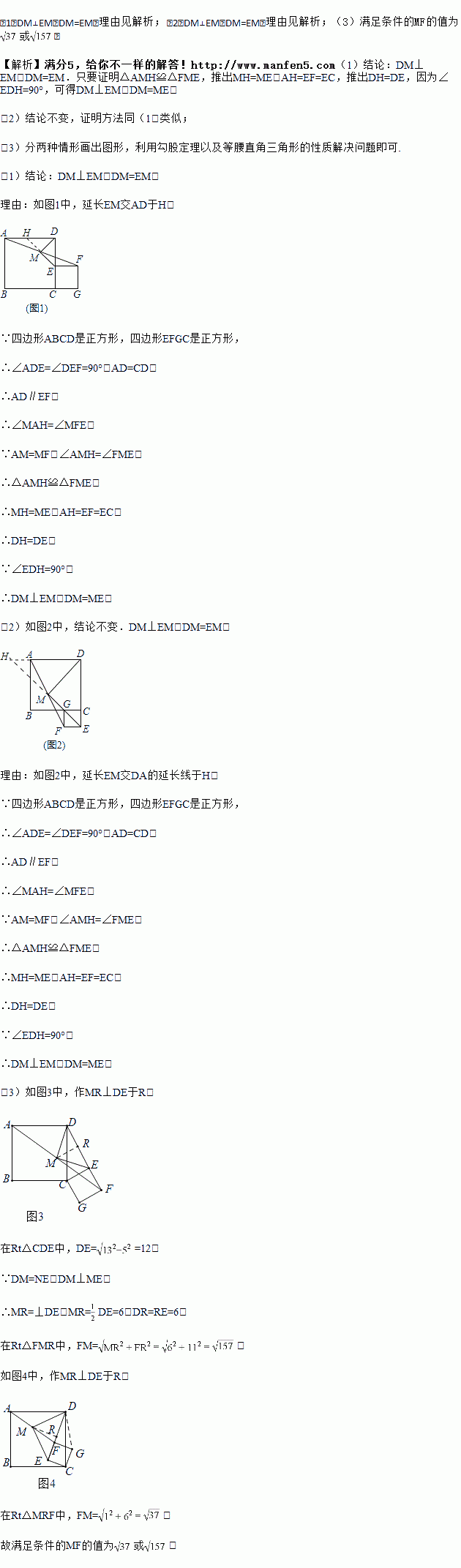 (3)将图1中的正方形CEFG绕点C旋转,使D,E,F三点在一条直线上,若AB=13,CE=5,请画出图形,并直接写出MF的长.