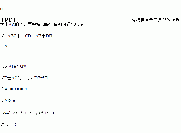 如图,在△ABC中,CD⊥AB于点D,且E是AC的中点.若AD=6,DE=5,则CD的长等于( )