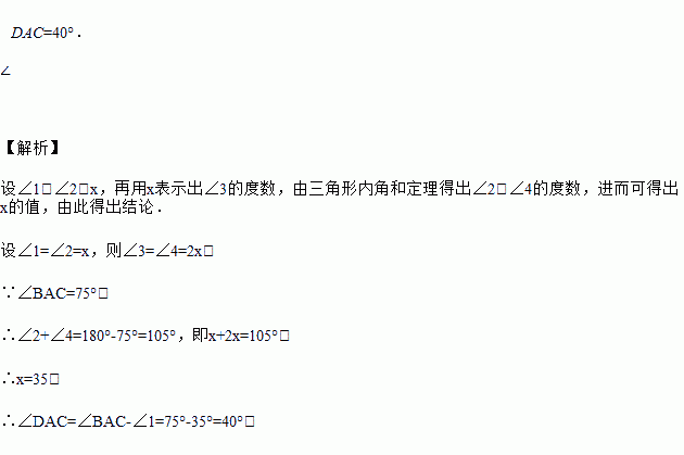 如图,在△ABC中,D是BC边上一点,∠1=∠2,∠3=∠4,∠BAC=75°,求∠DAC的度数?