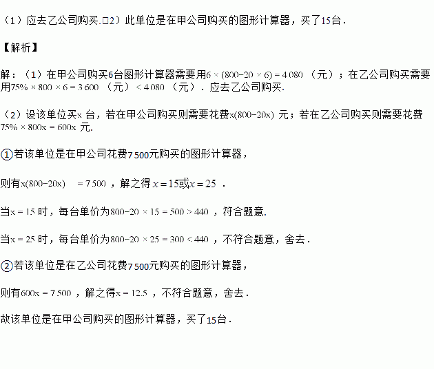 有一批图形计算器,原售价为每台800元,在甲、乙两家公司销售.甲公司用如下方法促销:买一台单价为780元,买两台每台都为760元.依此类推,即每多买一台则所买各台单价均再减20元,但最低不能低于每台440元;乙公司一律按原售价的75%促销.某单位需购买一批图形计算器: