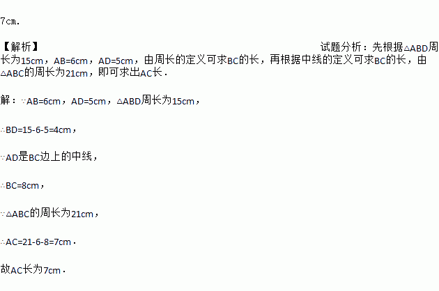 如图,已知△ABC的周长为21cm,AB=6cm,BC边上的中线AD=5cm,△ABD的周长为15cm,求AC的长.