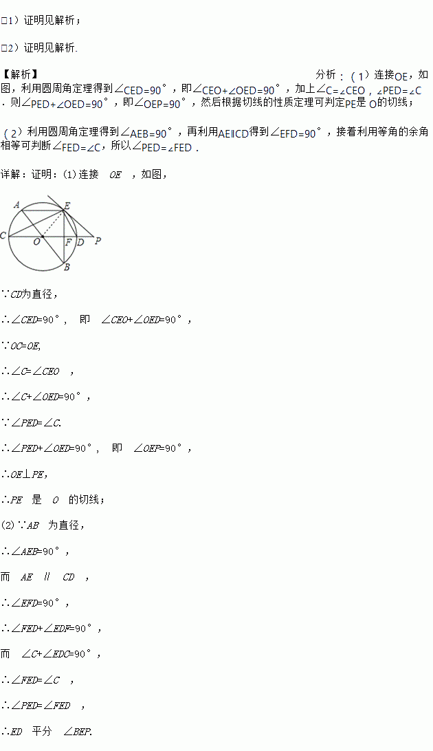 如图,AB、CD为⊙O的直径,弦AE∥CD,连接BE交CD于点F,过点E作直线EP与CD的延长线交于点P,使∠PED=∠C.