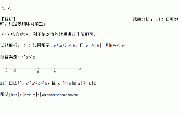 < < 【解析】试题分析:(1)观察数轴,根据数轴即可填空; (2)结合数轴,利用绝对值的性质进行化简即可. 试题解析:(1)如图所示,c<a<0<b,且|c|>|b|,则b+c<0, 故答案是:<;<; (2)由图知,c<a<0<b,且|c|>|b|,|a|>|b|, 所以|b﹣a|﹣|b+c|+|c|=b﹣a﹣b﹣c﹣c=﹣a﹣2c.