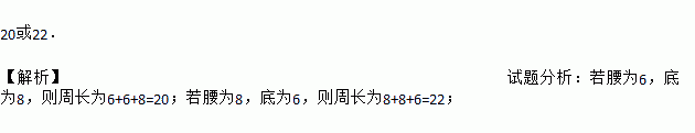 若等腰三角形的两边长为6,8,则它的周长是 .