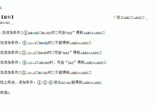 如图,下列条件能保证△ABC≌△ADC的是:①AB=AD,BC=DC;②∠1=∠3,∠4=∠2;③∠1=∠2,∠4=∠3;④∠1=∠2,AB=AD;⑤∠1=∠2,BC=DC.( )