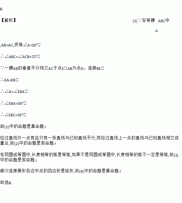 B 【解析】(1)∵在等腰△ABC中,AB=AC,顶角∠A=36°, ∴∠ABC=∠ACB=72°, ∵一腰AB的垂直平分线交AC于点E,AB为点D,连接BE, ∴EA=EB, ∴∠A=∠EBA, ∴∠EBA=36°, ∴∠EBC=36°, 故(1)中的命题是真命题; 经过直线外一点有且只有一条直线与已知直线平行,而经过直线上一点的直线与已知直...